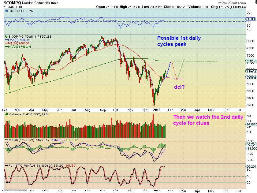 NASDAQ DAILY –   This can be the path of the first daily cycle.  Then the 2nd will be  able to tell the story of weakness or strength.