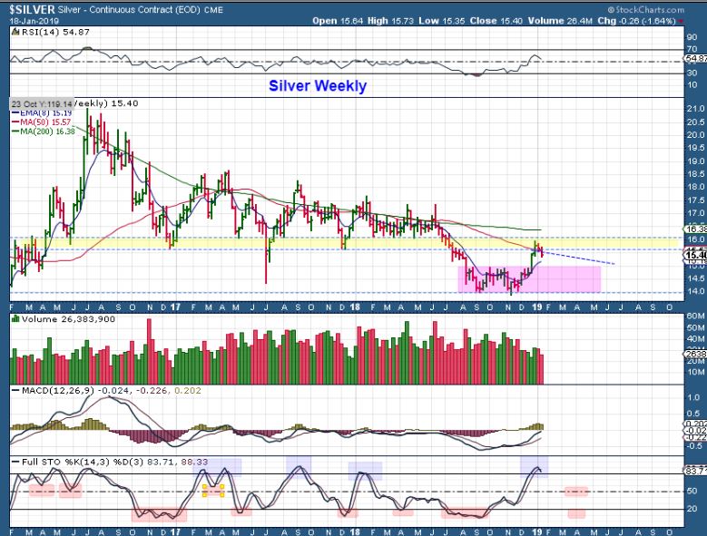 GDXJ  WEEKLY #3 of 3 –  The only way to see a bullish view is to look at a Bull run  ( like 2016 here). The pull backs were sideways & shallow (and that could happen)  and the stochastics just stayed overbought.  You can see why we need to watch this play out.