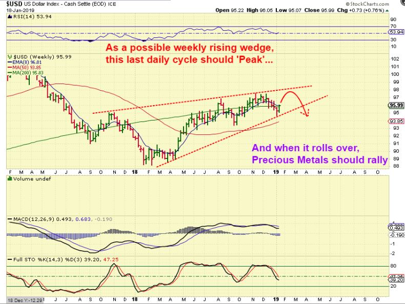 USD  – The USD has a weekly swing low, it is moving higher in this daily cycle and Gold and Miners are rolling over.  Watch for the USD to roll over again as shown here  ( or not).  Read the chart.