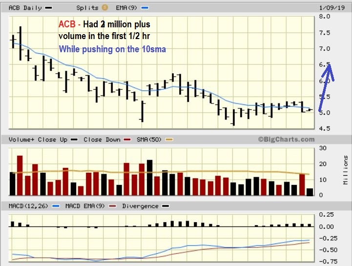 ACB #1  – I captured this chart after Buying ACB  Wednesday morning. I saw volume flowing in and intraday charts were looking good. Smaller time frame set ups were Bullish, so I just bought it at these lows.