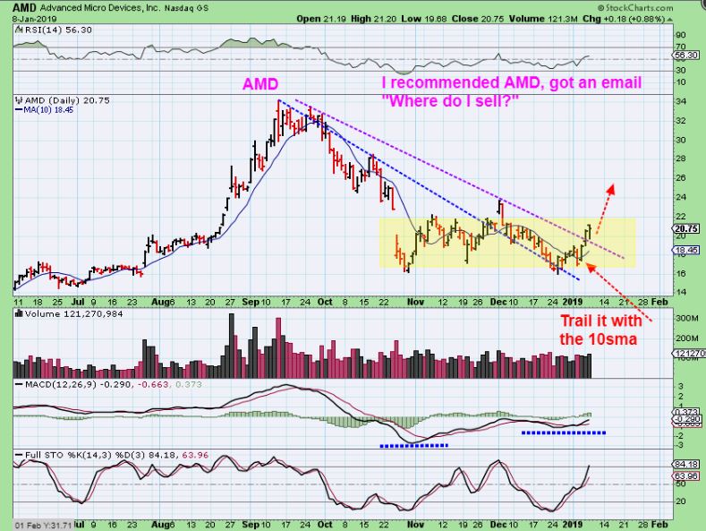 AMD   –   AMD was a double bottom ‘buy’ and I mentioned it as a buy when the markets bottomed.  I was asked yesterday , “Would you sell AMD yet?”   I dont think I would sell yet.   I see it as breaking out here and…