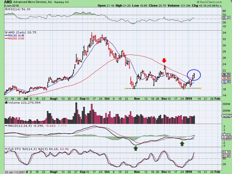 AMD   – It is now Closing above the 50sma, so I would raise my stop and probably let it run.  Some individual stocks can run higher , even if the markets get choppy.  This may be one of them.