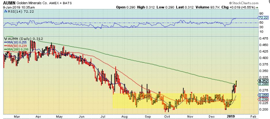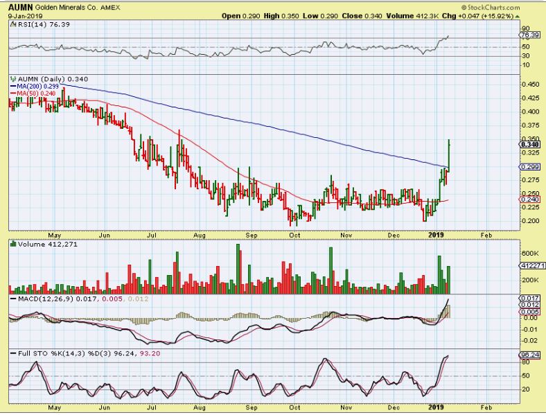 AUMN #2  –  It actually ran up about 20% & closed up 16% Wednesday.  AUMN always seems to move very quickly.   It may back test that 200 sma in time, but this is one that I may just ride now.  Under bullish conditions,  AUMN  usually acts quite Bullish.