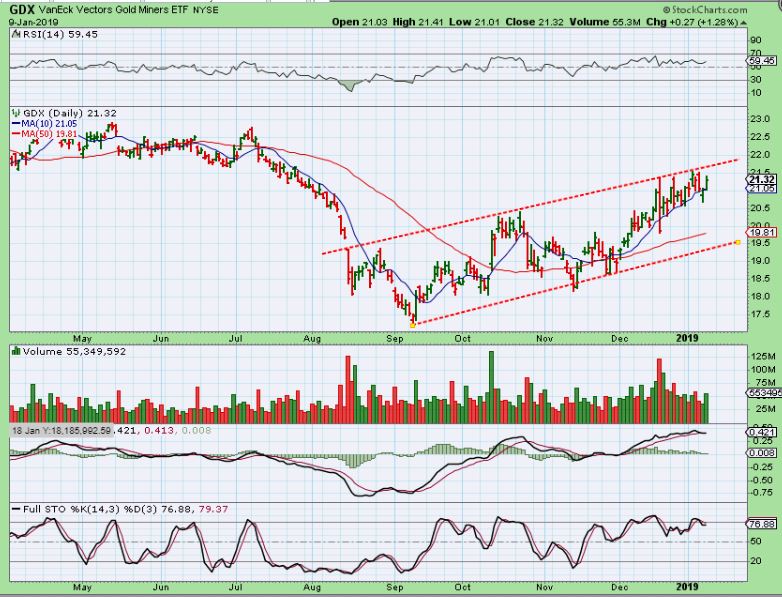 GDX –  And nothing has changed here either.  It is very choppy day by day, but still climbing the 10 sma & riding along the upper channel.