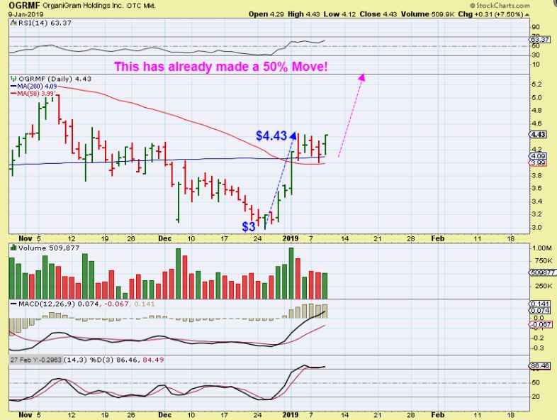 OGRMF #2   –  Again, It  ALREADY moved 50%  in 5 days and remains bullish looking as it flags above the 50 & 200 sma.  It is a buy here again, use a stop under support.