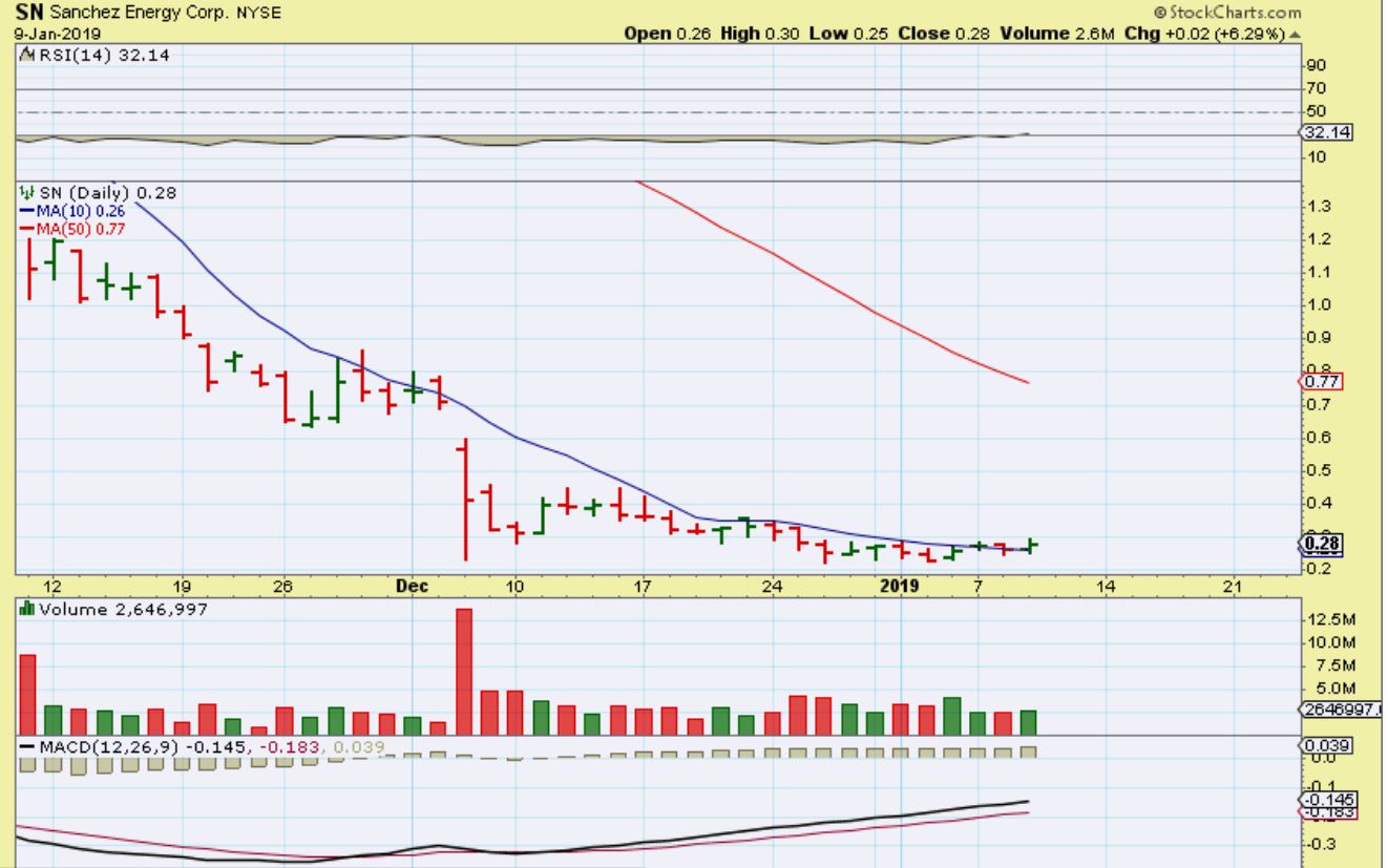 SN    –  High risk, High reward.  This energy stock crashed recently  and has capitulation volume at the lows.   It then formed a base.  If SN takes off from here, I can see it easily doubling from $0.28 to $0.70 at the 50sma.   It is risky though, they have been notified of possible de-listing soon from the NYSE, but they do have time to prove themselves.   This look ready to go, so our day traders can keep an eye on it.