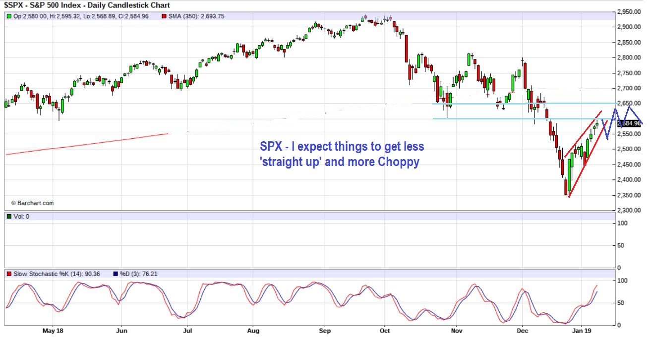 SPX  –  We just recovered the straight down drop. There was no resistance there, so we ran straight up.  As we hit resistance , things could get choppy.   I expected a first daily cycle to be bullish, but it needs a bit more babysitting now, especially if you are leveraged.