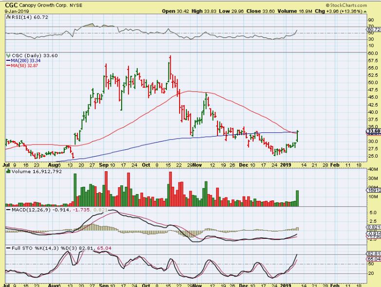 CGC    – On Wednesday volume  surged and gradually moved up over 13%.  This was lagging a bit in the sector, but may now play catch up.  It is trying to break through double resistance,  which then should act as support if price can move higher.