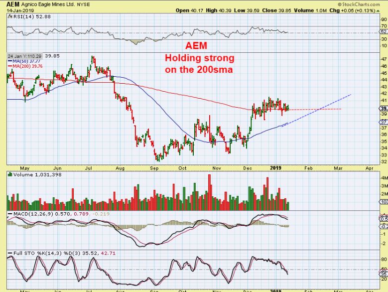 AEM – After a bullish run $33ish to $41, we’ve had 1 Month of sideways chop. This is consolidating along the 200sma, and that helps it to go from Overbought to oversold. It remains bullish and I think that it can be bought since it is holding the 200sma area rather well, but that doesn’t mean that it cant tag that 50sma on a quick drop too.