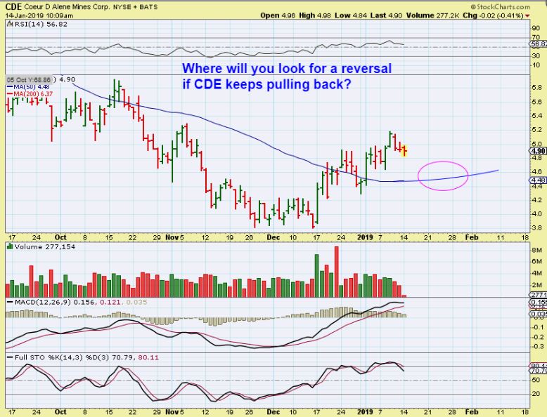 CDE – CDE actually closed at $4.93, it is not selling off much. I drew a possible target if we get the sell off, but so far it remains above the 10sma (not shown) .