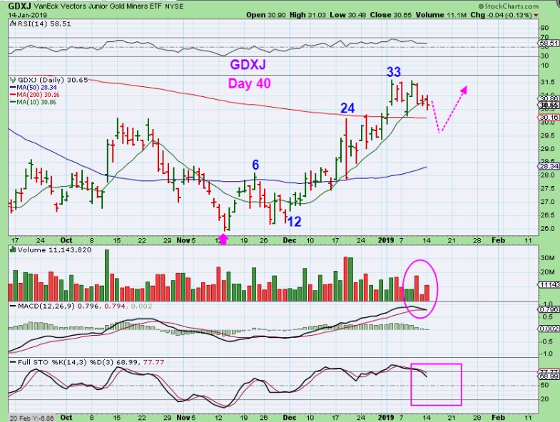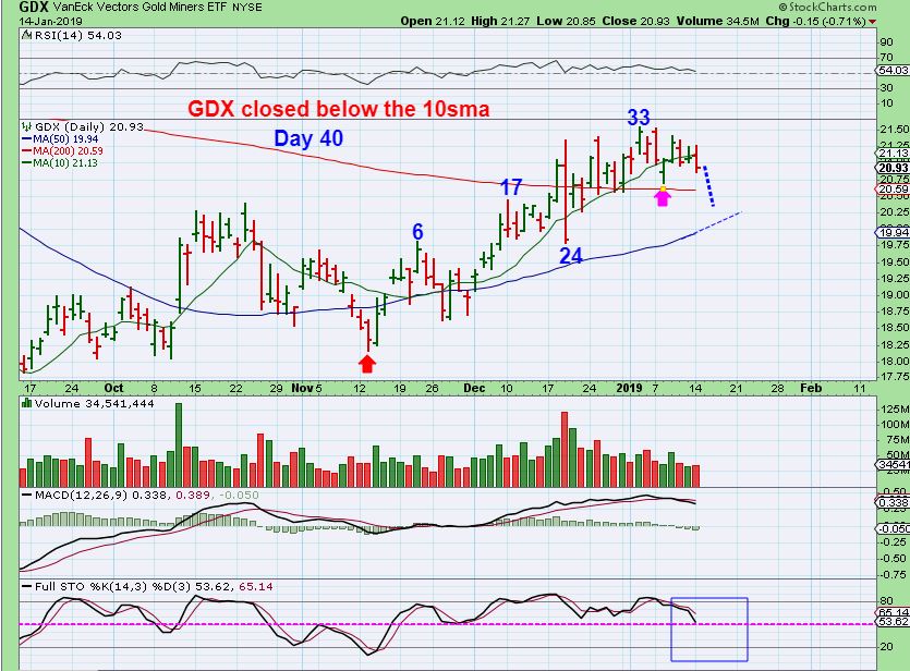 GDX – GDX closed below the 10sma Monday. SO in my head I am wondering : Is this day 40, or was that quick reversal 4 days ago a mini dcl and this is day 4? We will know soon. This can drop to the 200sma or 50sma and be an excellent buy.