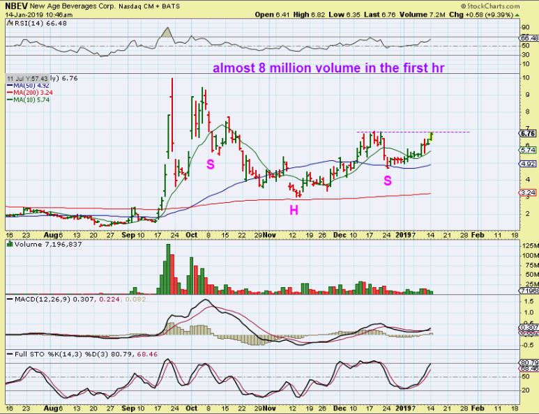 NBEV – I posted this in the comments area, it was about to break above the recent highs and that is the inverse H&S that I have been pointing out. I own it and I added earlier in the day near the open.