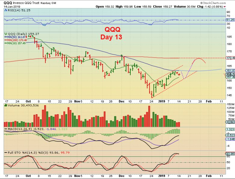 QQQ – I still expect this to eventually move higher above the 50sma, and then a peak to the first daily cycle.