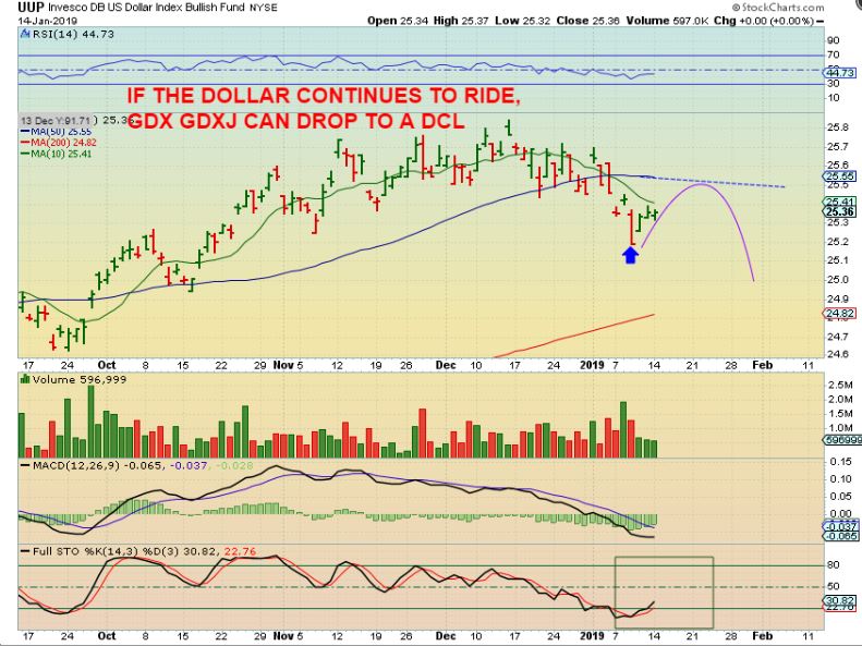 UUP – GDX & GDXJ dropped again Monday. The USD ( UUP) may have a dcl here. If this bounce continues , GDX can drop a bit more to the dcl.