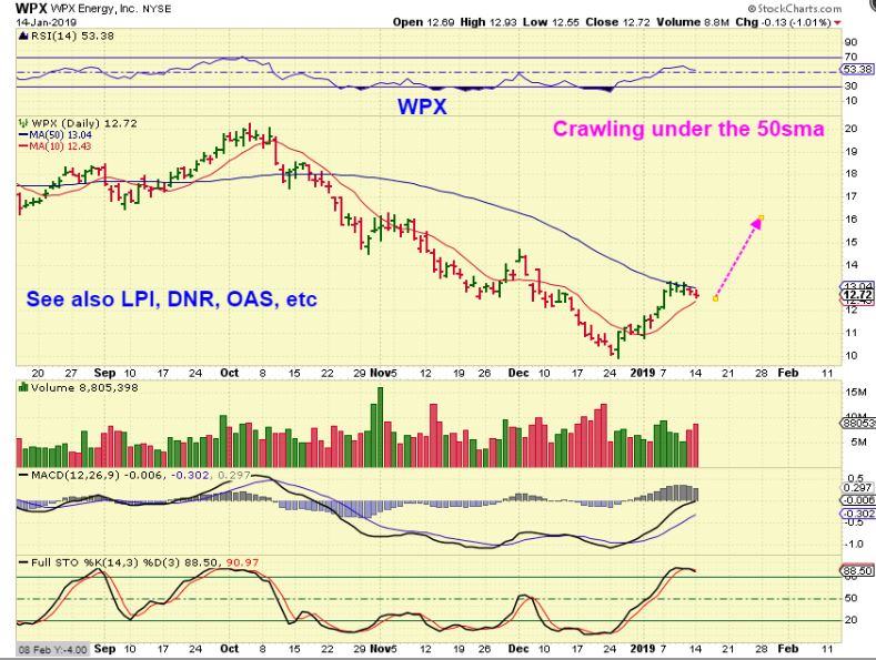 WPX – WPX is hugging the 50sma, and so are many other Oil / Energy stocks. See also LPI, DNR, OAS, AREX, AXAS, etc The sector looks to be setting up for the next leg higher.
