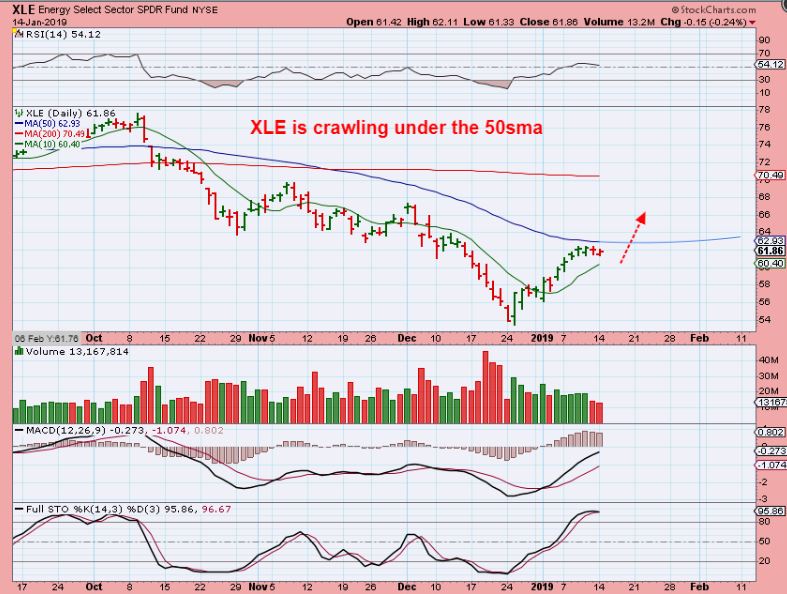 XLE – Crawling under the 50sma is usually resolved bullishly if it hugs the line. Let’s look at a few Oil / Energy charts too..