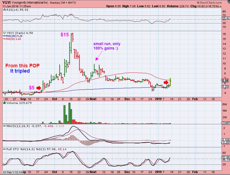 YGYI – landed on and rode the 200sma as support. With this POP, I posted that I bought YGYI, a FAST Stock, a bit risky. I used an intraday chart to buy it. The last time it Popped at $5, it tripled. 🙂