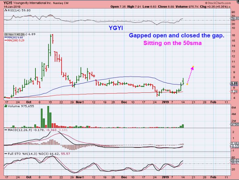 YGYI – Monday it gapped open over the 50sma and then closed that gap, landing on the 50sma, so I added to my original position. I still think that this will run higher, so if it reverses , it could be considered a buy ( but a fast moving stock). At least it trades on the NASDAQ.