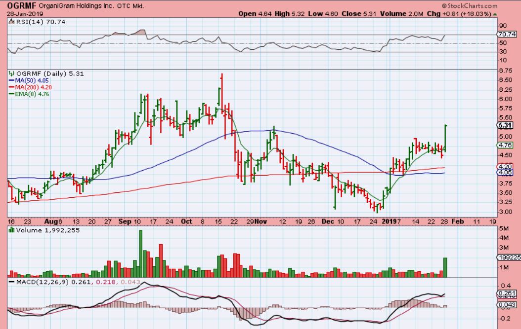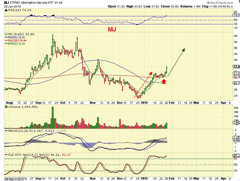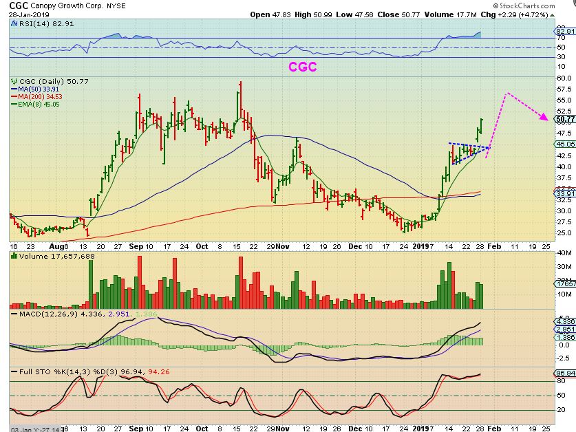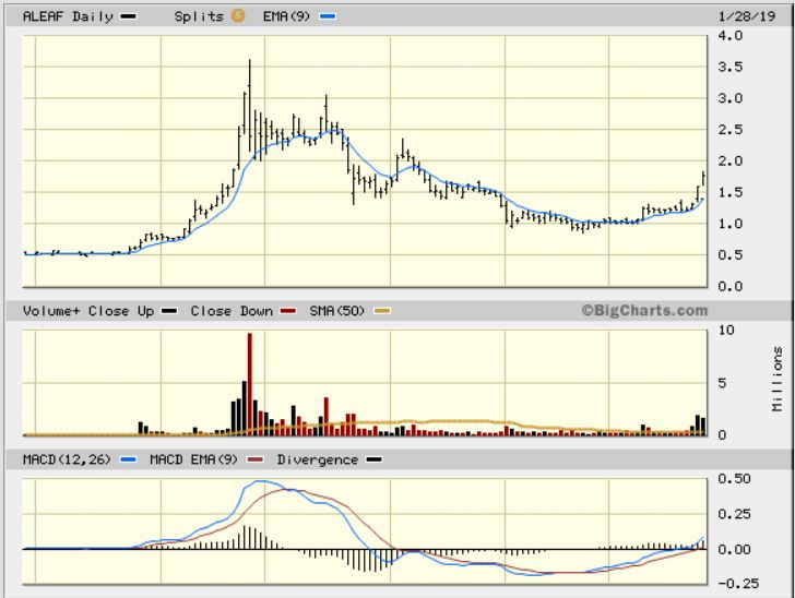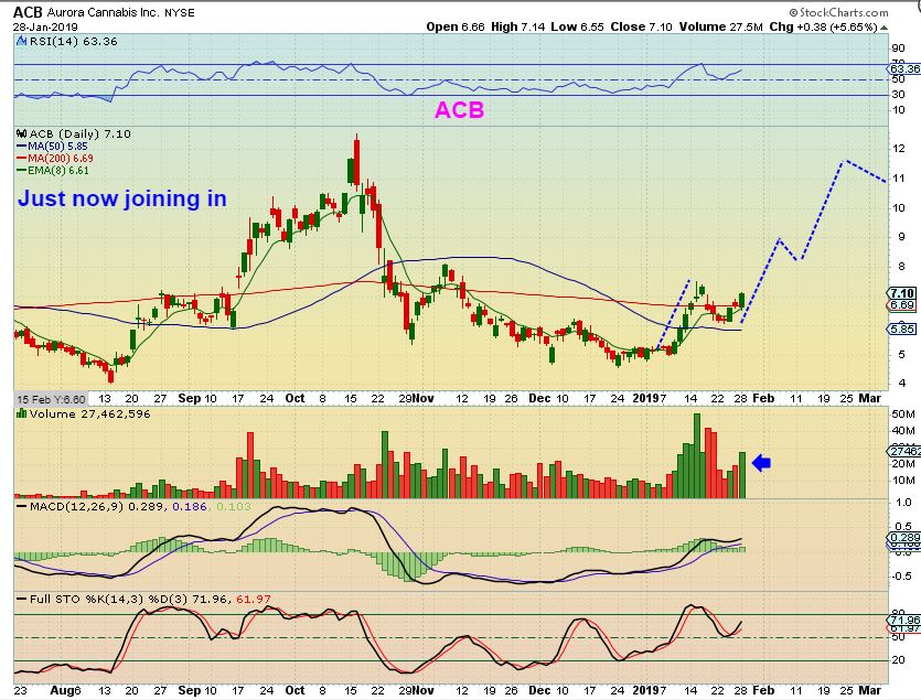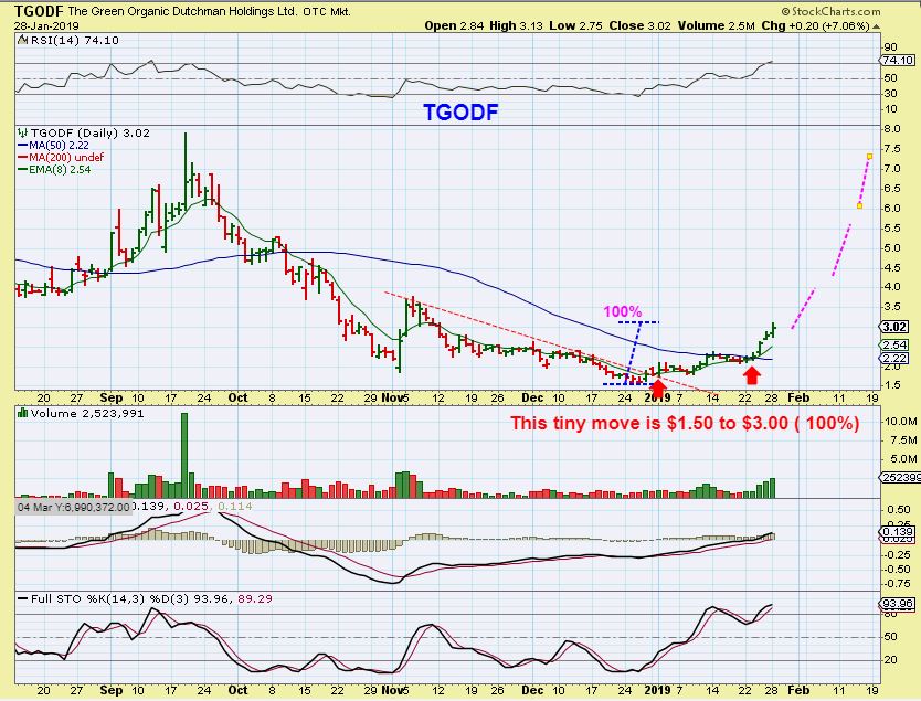 ALEAF was recommended at $1, and it almost hit $2 already ( 100%) , and I don’t think that it is finished yet. Again, many of these are forming Cups. Look at the left hand side of the chart, and you’ll see that they follow the 8 ema, but it doesn’t have to be straight up day after day after day.
