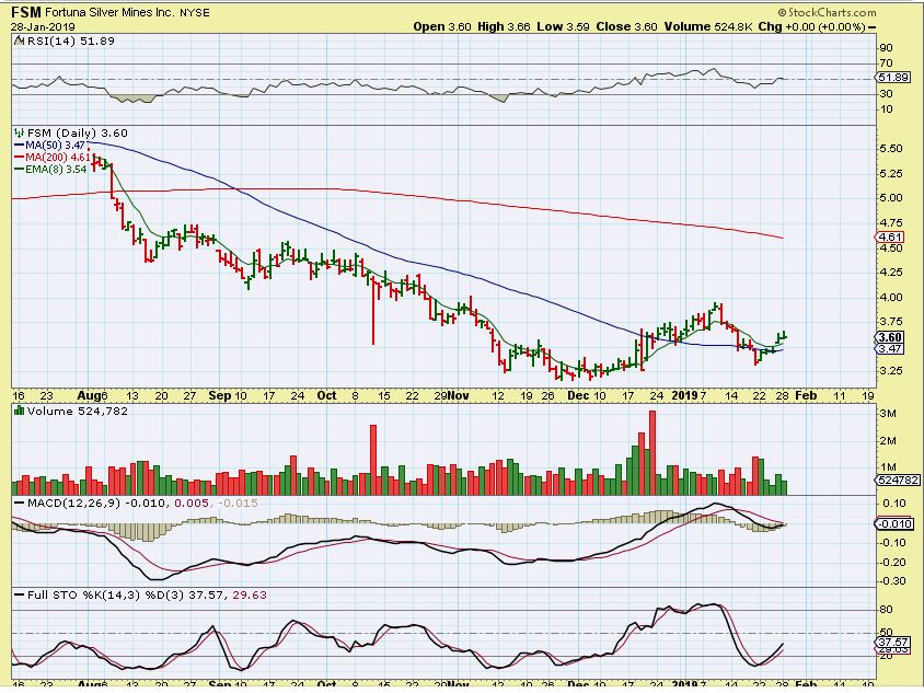 FSM – FSM and many other silver stocks are above the 50sma. These types of set ups are low risk entries, and Silver does look like it wants to push higher.