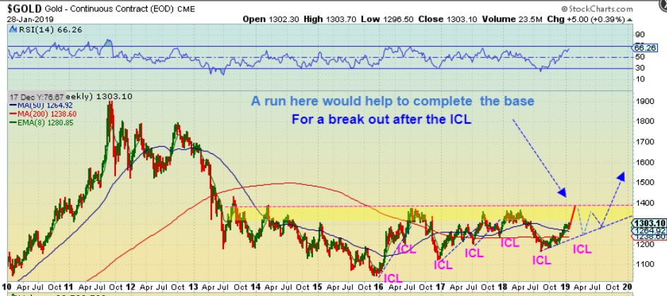 GOLD – A sharp run higher from here could also complete the top of the big picture ‘base building’. That would be followed by a higher low (ICL) and then the next intermediate Cycle breaks out & a strong multi week rally would be Very Bullish and profitable. This looks reasonable .