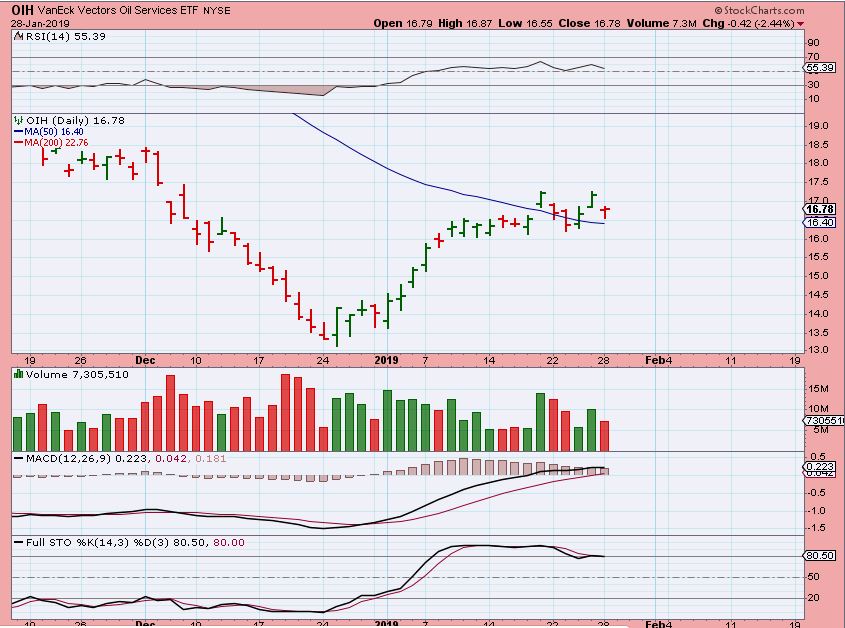 OIH – Notice that the OIH broke down last week & recovered, but with OILS drop Monday, the OIH dropped and was bought back up off of the 50sma. So far, it is fine.
