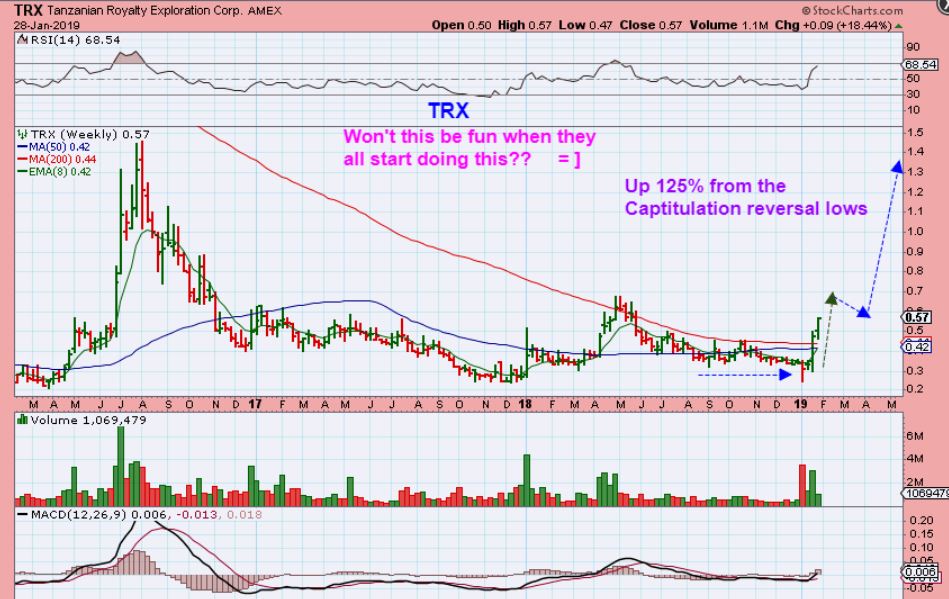 And YAY for our TRX WEEKLY RUN– After that capitulation reversal, TRX is up 125% in 3 weeks and 1 day : ) . This is now also a break out over the weekly 50 & 200 moving averages.