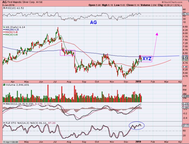 AG – Ag is one that did make a nice little run in December. It is in a double bottom base, and looks pretty good here.  It dropped to the 10sma Tuesday and reversed higher too.  This may just crawl along the 200sma, or it could break out.