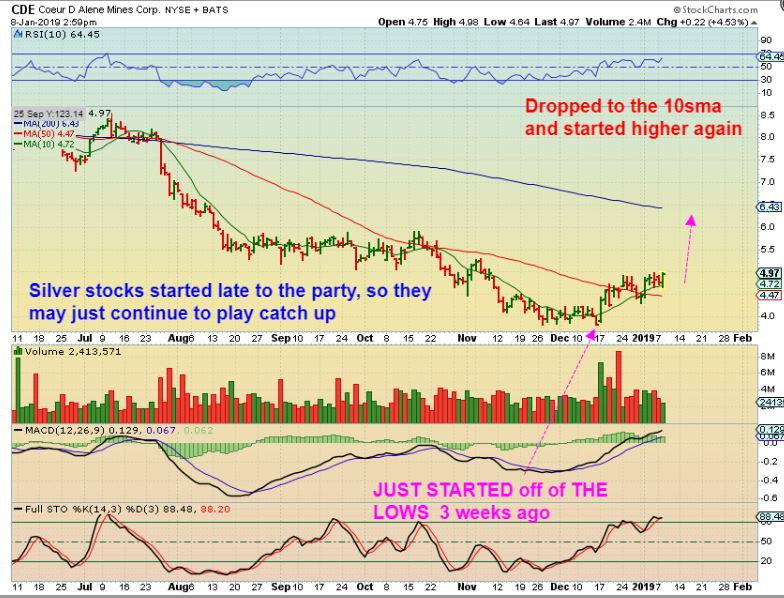 HL –   It started flagging sideways and Tuesday HL has a 10 % POP.  Again,  this happened while GOLD, GDX, and GDXJ were down.  SO IF CYCLES SAY GOLD & GDX Need  a pull back,  maybe some of these that didn’t join in on the run higher in December  (laggers or Base building) will still just do  their own thing in January?