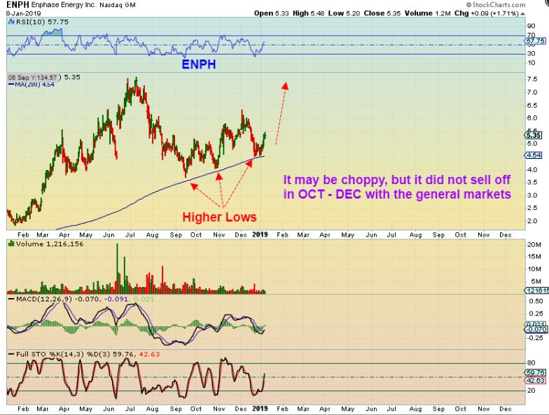 ENPH 2–  Unfortunately, I didn’t catch it on the moving average that acts as major support ,  but it can still be purchased with a reasonable stop .    I will show you why shortly, but first, doesn’t this look like it wants to run from $5 to $7.50 , since it has higher lows and higher highs?  And…