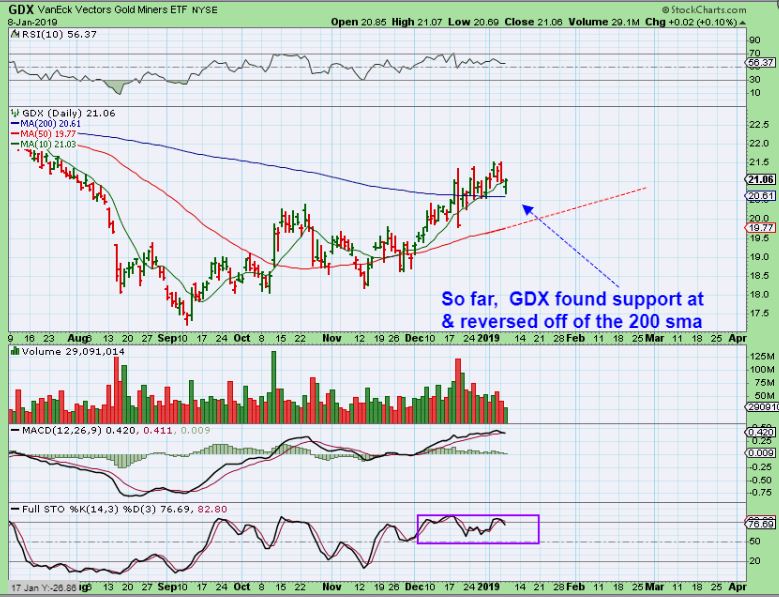 GDX DAILY  –  GDX dropped to the 200sma on Tuesday morning, but closed as a reversal by the days end. It closed green as buyers apparently bought the dip to the 200sma.