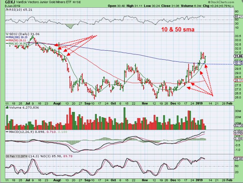 If we Do get a bigger pull back to the GDX  50 sma, certain traders may consider a leveraged ( JNUG or NUGT) entry with a stop, but this may just go sideways if buyers keep stepping in.