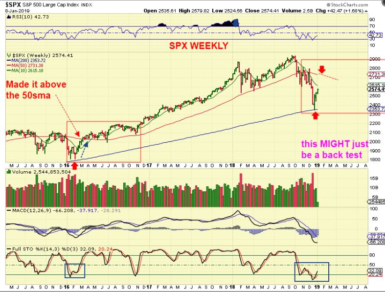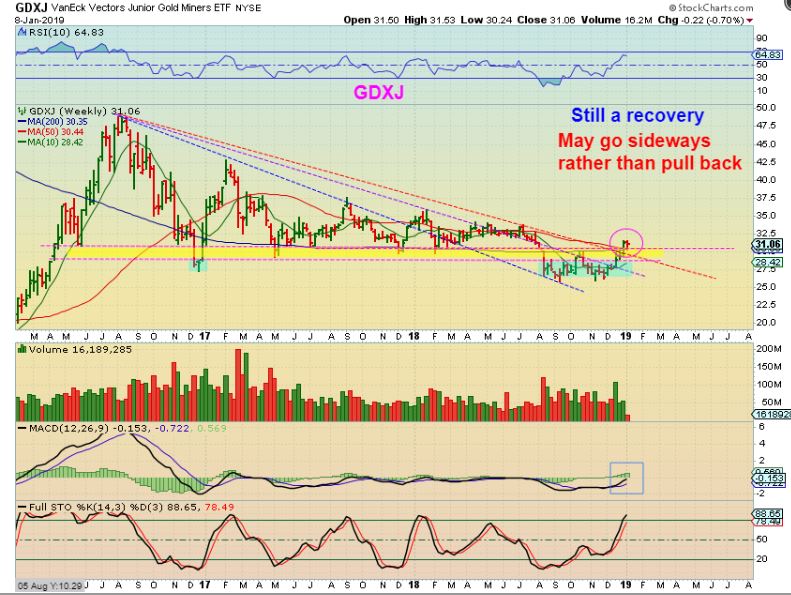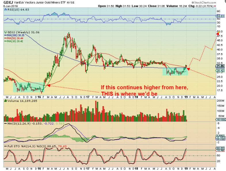 GDXJ WEEKLY  – Do you remember my chart similar to this, pointing out where we could be when compared to 2016 as we leave a blue base behind?  We are at the lows of a possible strong run higher over 2019.   This is a weekly chart and it ran higher for months.  I did catch the ICL in September, but after 2 months of choppy slop, I sold JNUG because 2016 had a final shake out low.  This one did not, it recovered at the end of December.