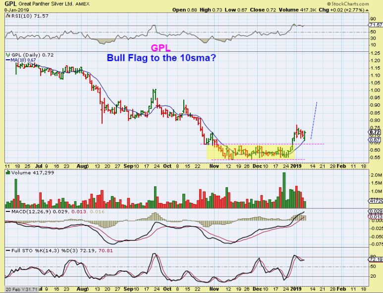 GPL  –  It has Bull Flagged at 70-75 cents cents  and reversed after dropping to the 10sma Tuesday. This broke from a base and flagged and is a buy in this area if you ask me.