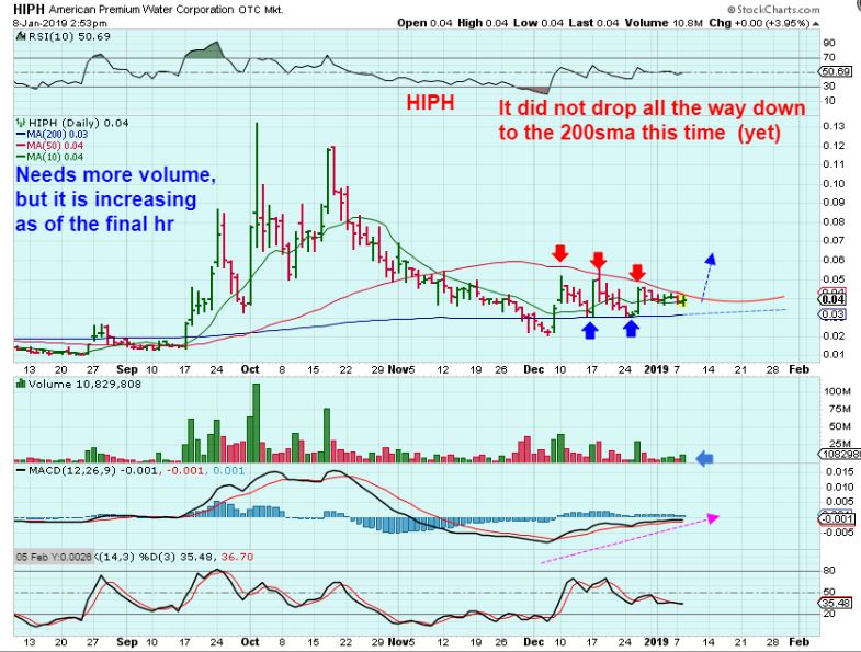 HIPHThis has been bouncing off of the 200 sma and bumping into the 50 sma.  I own it.  It is Pinched and should break out, but we’ll see. Volume was a bit larger by the close.