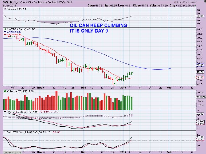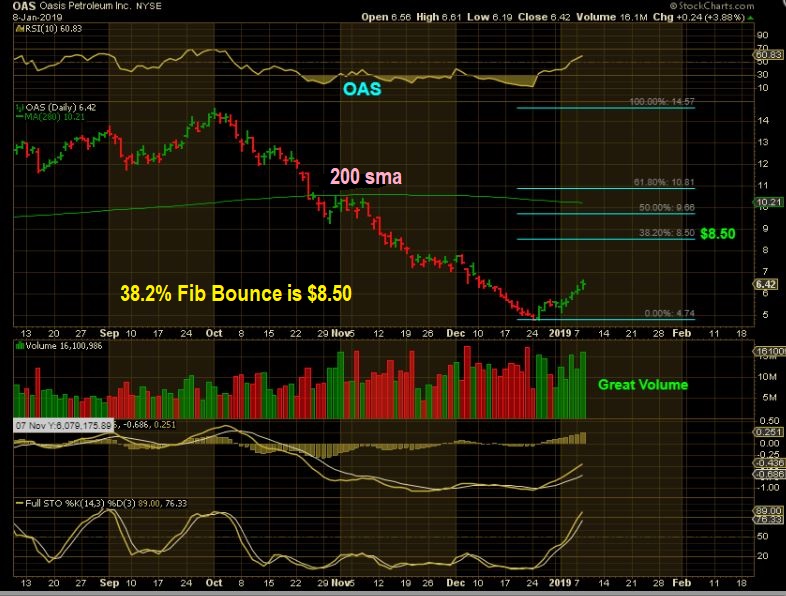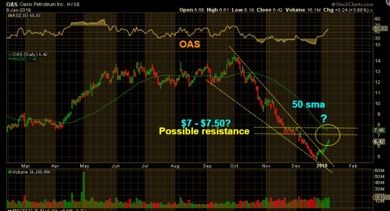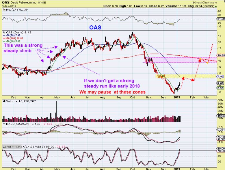 OAS #2 –  The 50sma ( $7-$7.50)  is also a probable target if Oil continues higher  ( A first target, it can go higher).   It could run there from short covering and buyers jumping in,  or it could take the 1-2-3-4-5 path, with this being wave 3 now.