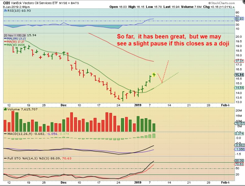 OIH  – I sold my GUSH, simply to lock in gains, but kept my Oil / Energy stocks.  GUSH (  or OIH, XLE, XOP)   can just continue higher day after day , just like the sell off dropped day after day.  It can be  either straight up from here or after a dip as shown.  If it back tests the 10sma,  I may re-buy a reversal there.