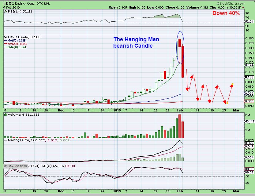 EDXC – I pointed out the ‘Hanging Man’ Candle as a sell , and showed an example where price falls after this recovery. This is usually a top and a ‘sell signal’. I sold more on Friday at the top and wrote in the comments that I sold yesterday morning too.