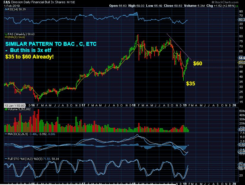FAS – The 3x Financial Bull etf may be worth watching too, if a pull back takes place. Look at that rally, $35 to $60. When the General Markets dip, this could drop to $45 or $50 and then make another run.