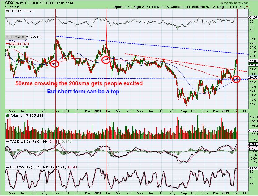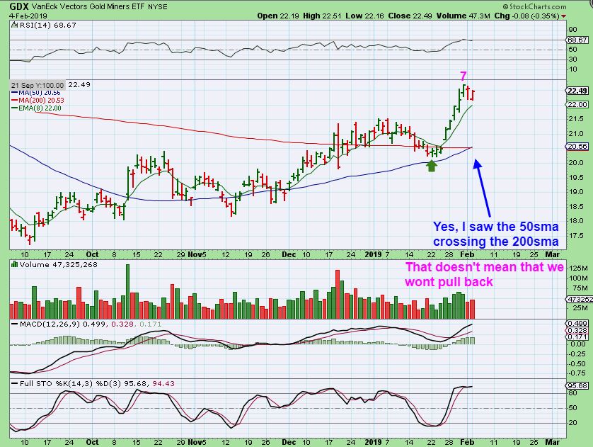 GDX – GDX dropped & reversed higher too. I was asked, “Did you know that the Golden Cross is taking place on Precious metals, isn’t that a Buy Signal? ” Golden Cross is the 50sma crossing above the 200sma. Yes, I did see that ‘crossover’ coming. And yes it is viewed as Bullish, I agree, but basically it means that things have been bullish & may be bullish long term too. That said, it is not a ‘short term Buy signal’. To be honest- I have seen Pull back Shortly after the 50 /200 cross more often than not . It is not a short term BUY signal.