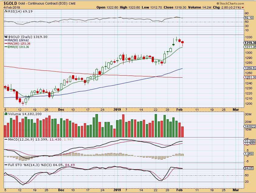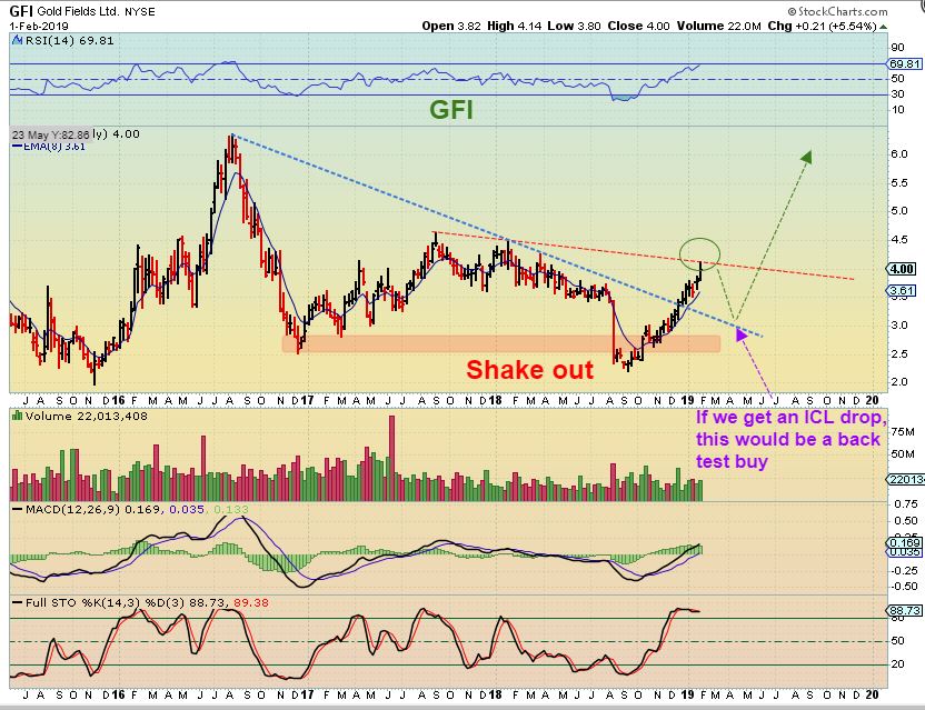 I am bullish Precious Metals long term in 2019, and I explained in the weekend report that the way Miners came out of the last ICL was deceptively Bullish. They built a base and then after looking choppy and weak, ramped up out of that base to complete the right side. Are they done and ready for a pull back yet? While I think that everyone here knows that I am bullish long term, I still recommend using reasonable stops to lock in gains or protect profits , since we are also coming due for that ICL and it may be more of a drop than many think possible. I want to discuss a few trades below, and it will include some Miners that are still very interesting set ups.