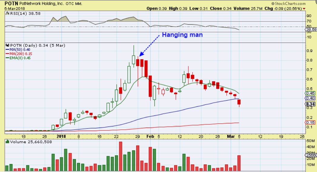 THIS IS ANOTHER EXAMPLE – POTN had a straight up run & then a hanging man. It then went from 80 cents to almost 30 cents in the next 4 days. It’s often a big haircut.