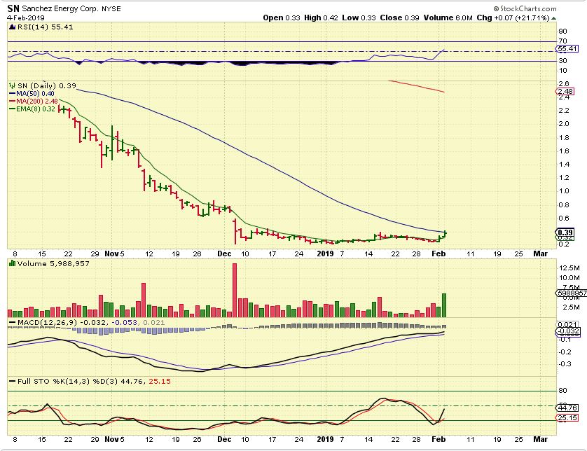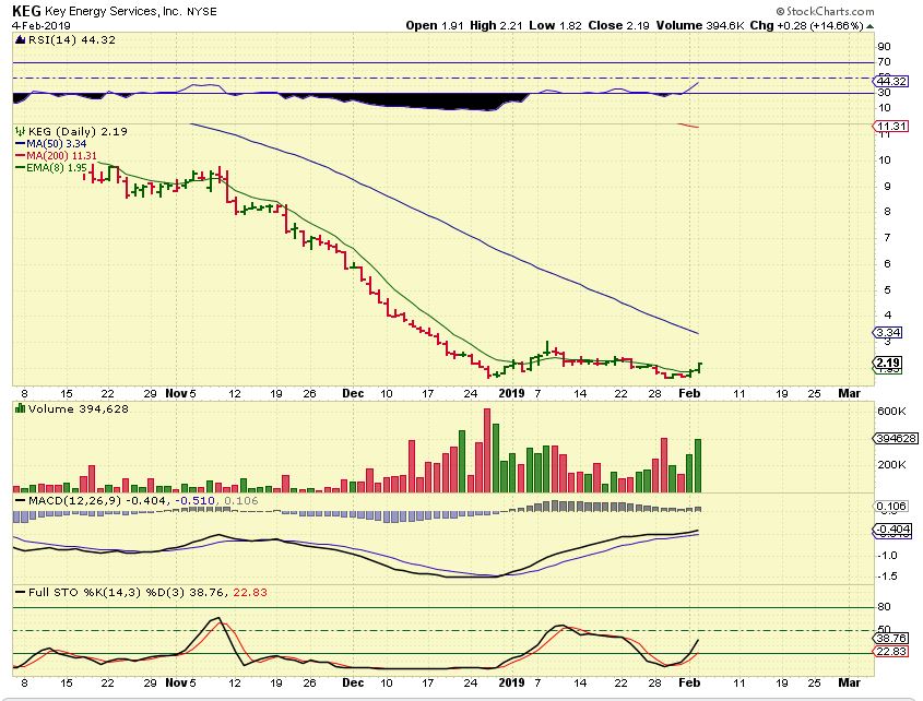 KEG – It is now climbing and suddenly popped 14% Monday. This looks very good, I would not sell it yet. A run to that 50 sma is big gains.