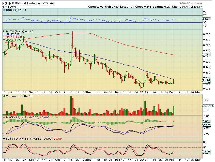 POTN – For those that like the penny stocks, POTN is showing signs of life with a bullish wedge breaking higher with some nice volume pops. I’d buy it as it is breaking through the 50sma, if that happens .