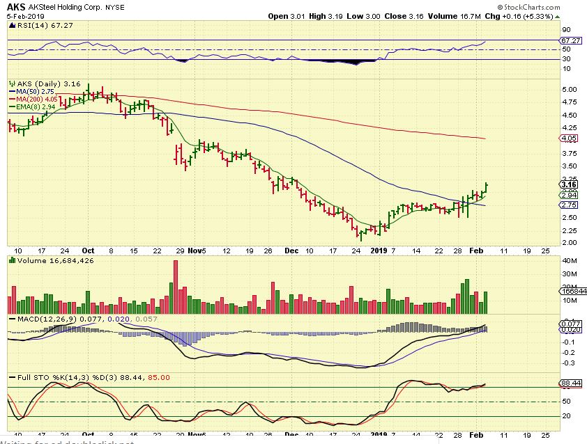 AKS – See also charts of WRN, CLF, X, HBM, etc. Again, this sector is also still acting bullishly after moving out of the lows.