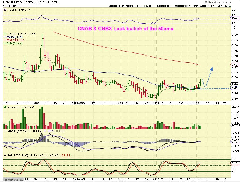 I ALSO LIKE CNAB & CNBX – If the MJ sector remains hot, these MJ stocks ( and others) are bullishly sitting on the 50sma so far, but also look ready to push higher.