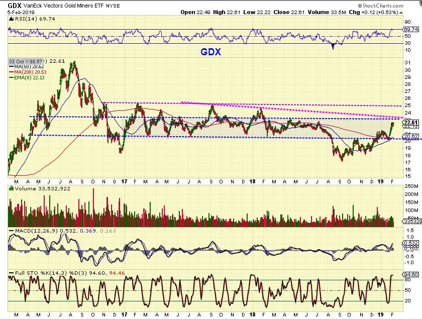 GDX – IF GDX moves higher, these are 3 close resistance points. A Blue & Magenta line are fairly close by around $23, and the Purple is near $25.