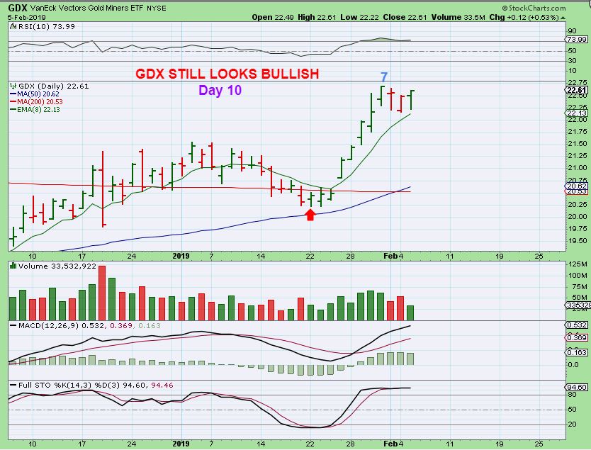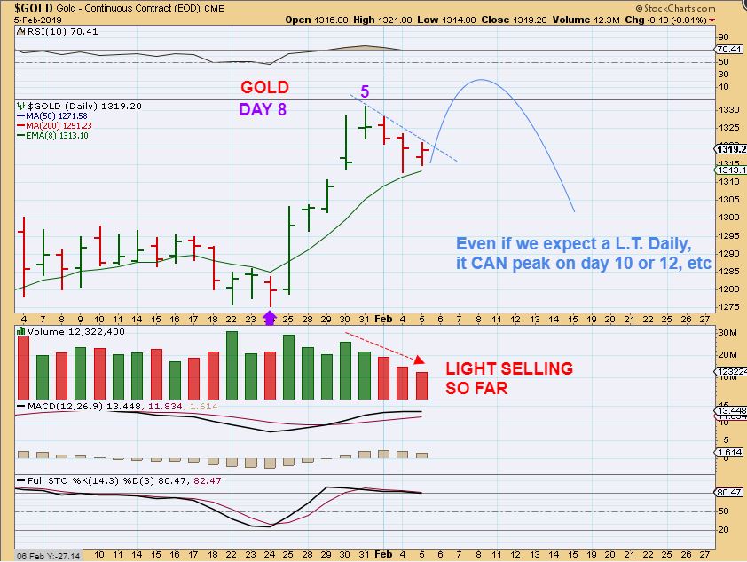 GOLD – Gold is on day 8 with a day 5 peak, and looks more bullish than bearish. In fact, it doesn’t look bearish at all at this point, it reversed on the 8 ema. It is only ‘Cycle count’ that adds caution.