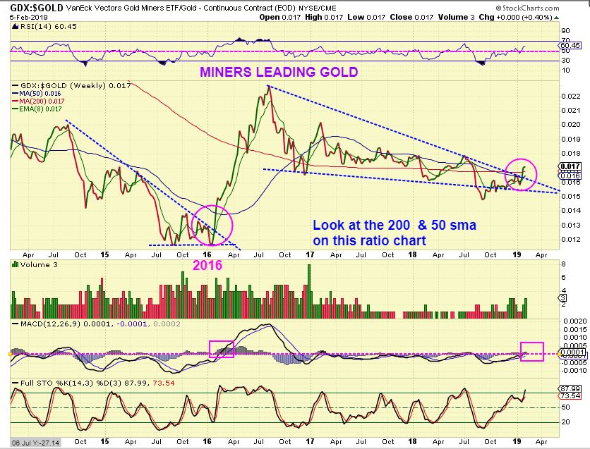 GDX / GOLD RATIO – This is something that I view as important, and it is breaking out ON A WEEKLY BASIS. It’s the weekly chart showing the Miners leading Gold. Notice the 2016 Break out. Miners were leading the way for a long time after that break out, SO MINERS could lead Gold here for Months. As we have seen…