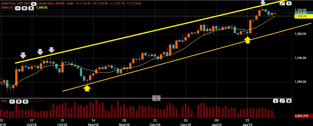 GOLD – Golds day 5 peak seems to match the 3 points in October that make up an upper channel line, and a bounce there again is not out of the question, so let’s zoom in….